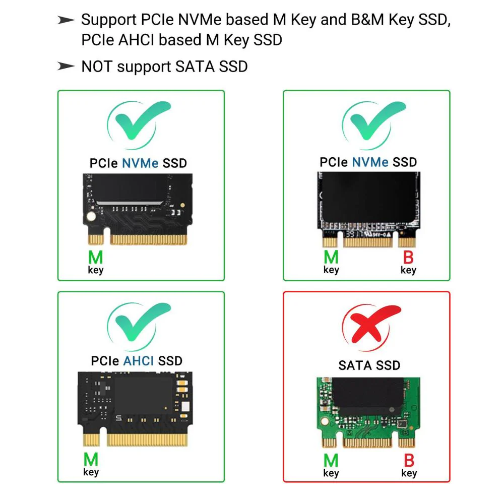 - [Supported SSD] - Support PCIe NVMe based M Key and B+M Key SSD,NOT support SATA SSD.