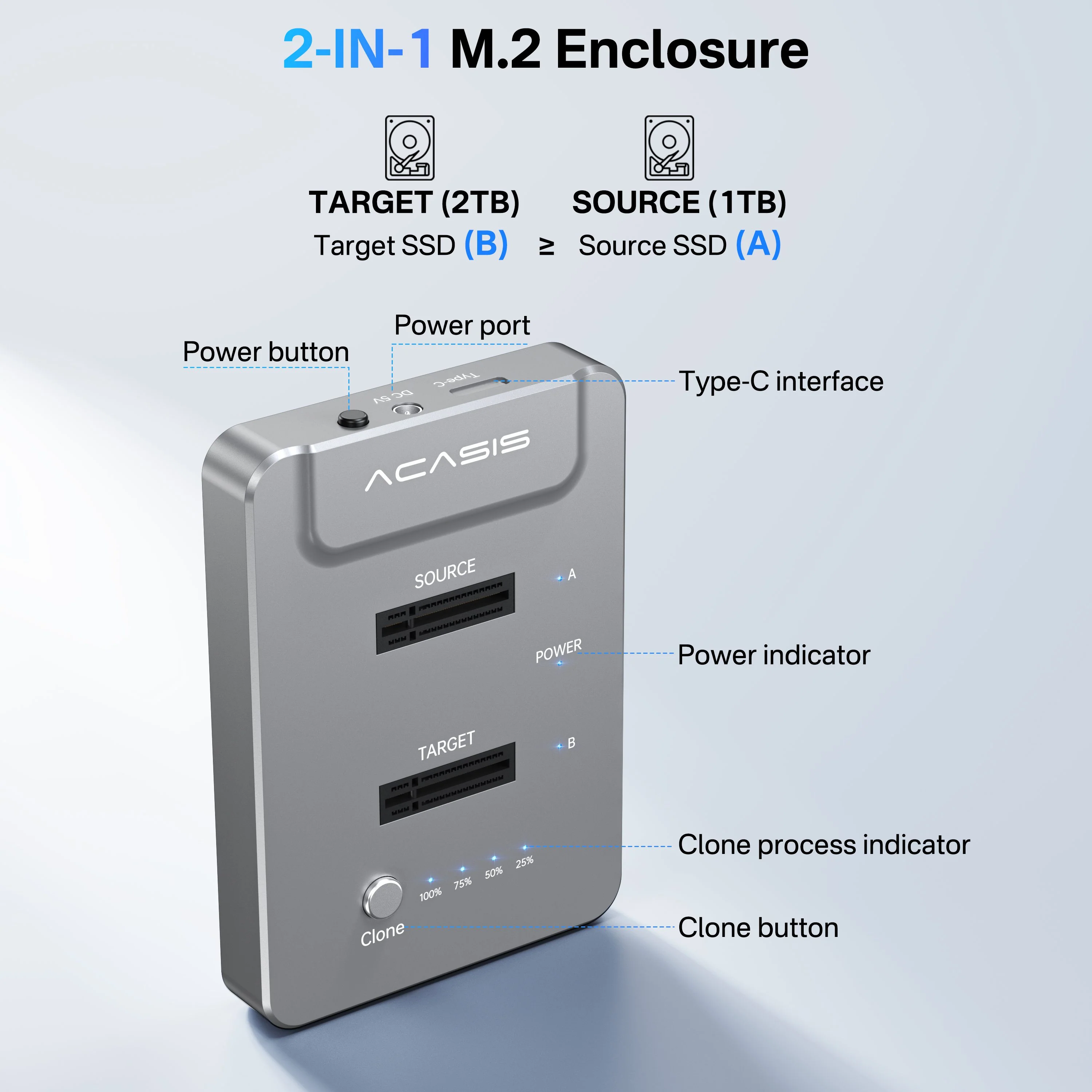 One Key Achieve Offline Clone and Duplicator. Just press and hold the Offline Clone button for 3 seconds, All various files, formats can be easily Offline Cloning and Duplicator in a few minutes by ACASIS dual-bay m.2 duplicator without connect computer. When the display reaches 100%,the file cloning is completed.