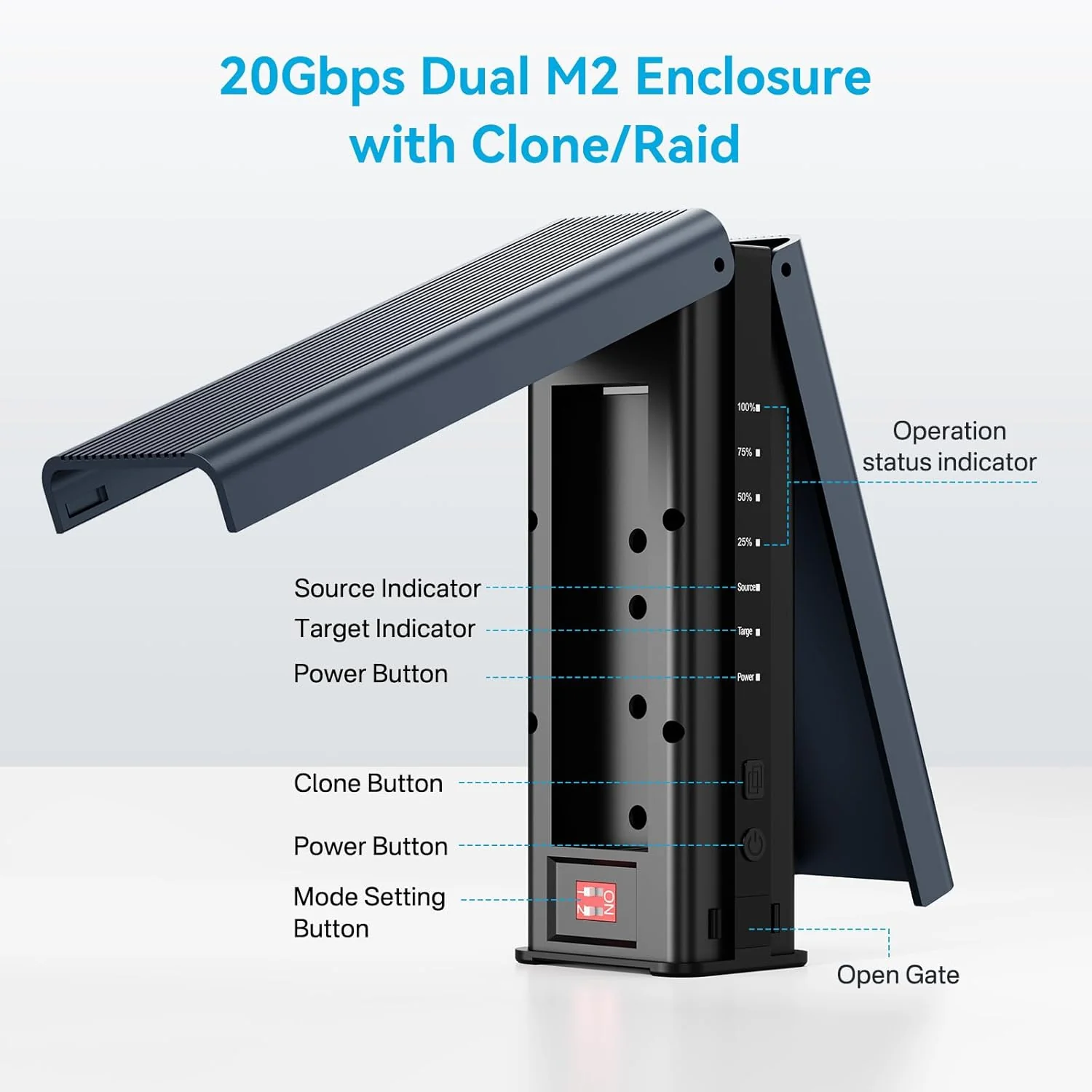 20Gbps High-Speed Online Transfer. The ACASIS M.2 NVMe Offline Clone Duplicator supports online transfer and simultaneous reading of two SSDs, with speeds up to 20Gbps.