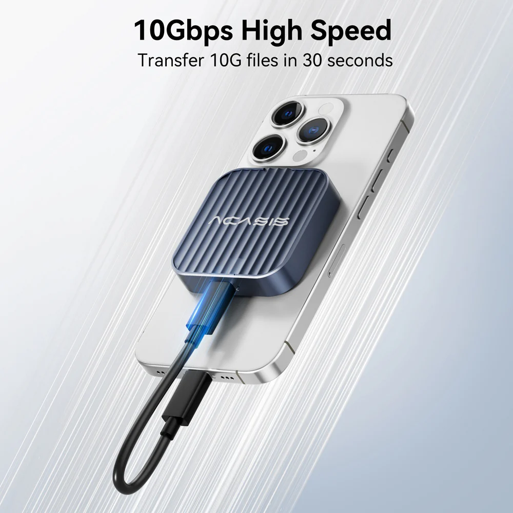 Transfer 1G File in 1 Second. Acasis USB-C Mobile Phone Magnetic SSD Case transmission speed is up to 10Gbps, After installing the NVMe SSD, the read and write speed can reach 900MB/s. And HD movie transmission only takes 2 seconds. The perfect data transfer and backup solution. Backward compatible with USB 3.1 Gen1 and USB 3.0.