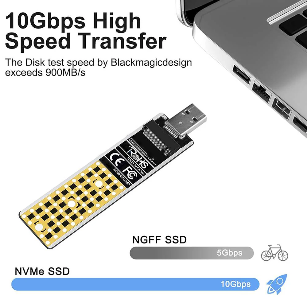 With USB 3.1 Gen 2 interface, the maximum transmission speed can reach 10Gbps. The read/write speed can reach 900Mbp when connected to NVMe or 500Mbps when connected to SATA.